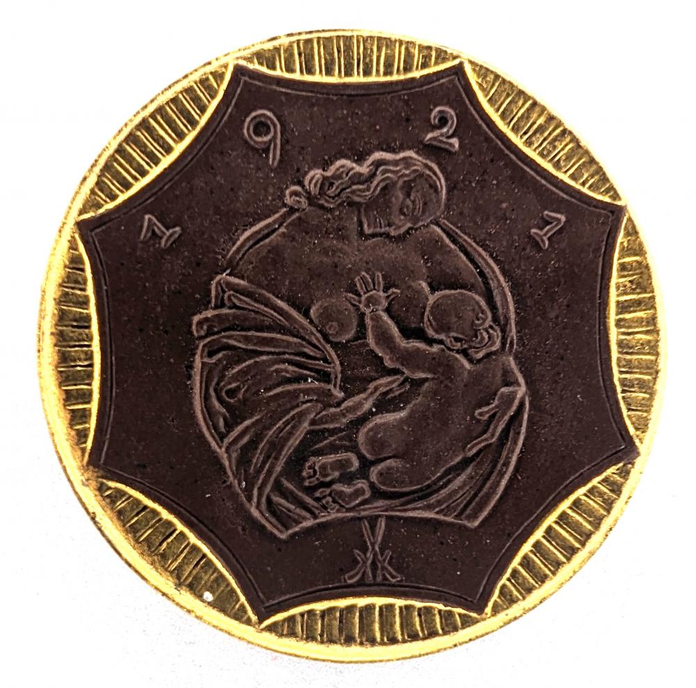 Tag: 1921 Sachsen 20 Mark, Saxony notgeld coin, Meissen mint crossed swords, German notgeld 1921, gilded edge notgeld, holed notgeld coin, breastfeeding mother coin, scalloped reeded rim coin, post-WWI German coinage, Coinantiquariat