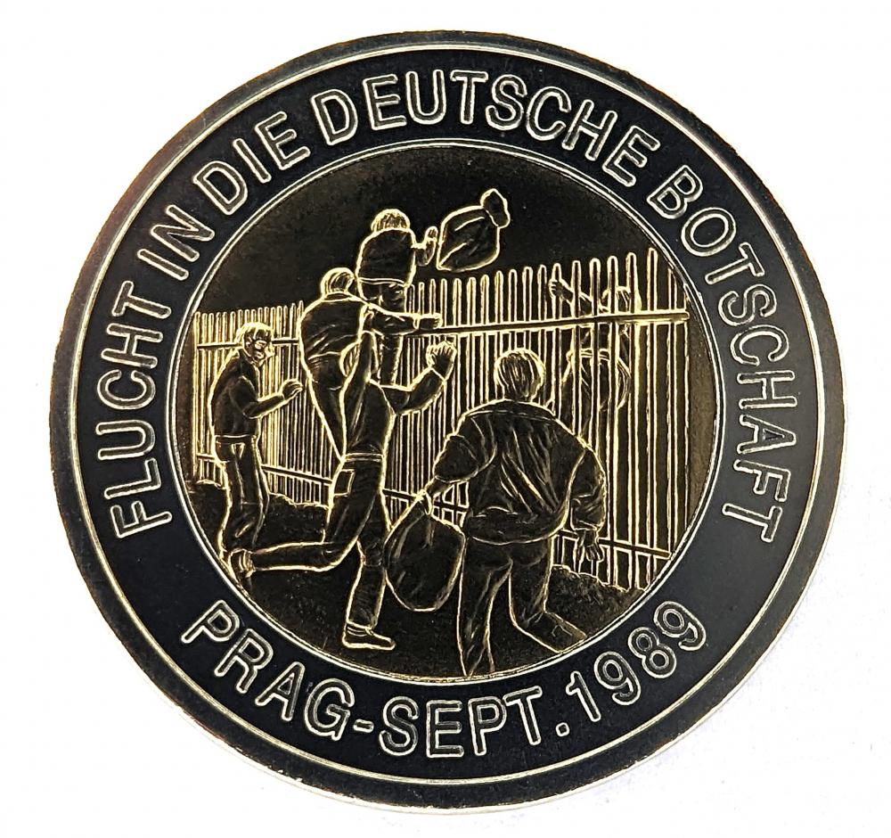 Commemorative medal marking the 20th anniversary of the fall of the Berlin Wall. The obverse shows the Berlin Arc with the inscription 20 JAHRE MAUEROFFNUNG 2009 1989. The reverse depicts children climbing over a wall with the inscription FLUCHT IN DIE DEUTSCHE BOTSCHAFT PRAG – SEPT. 1989. Issued as a reminder of the historical events of 1989 that led to German reunification.