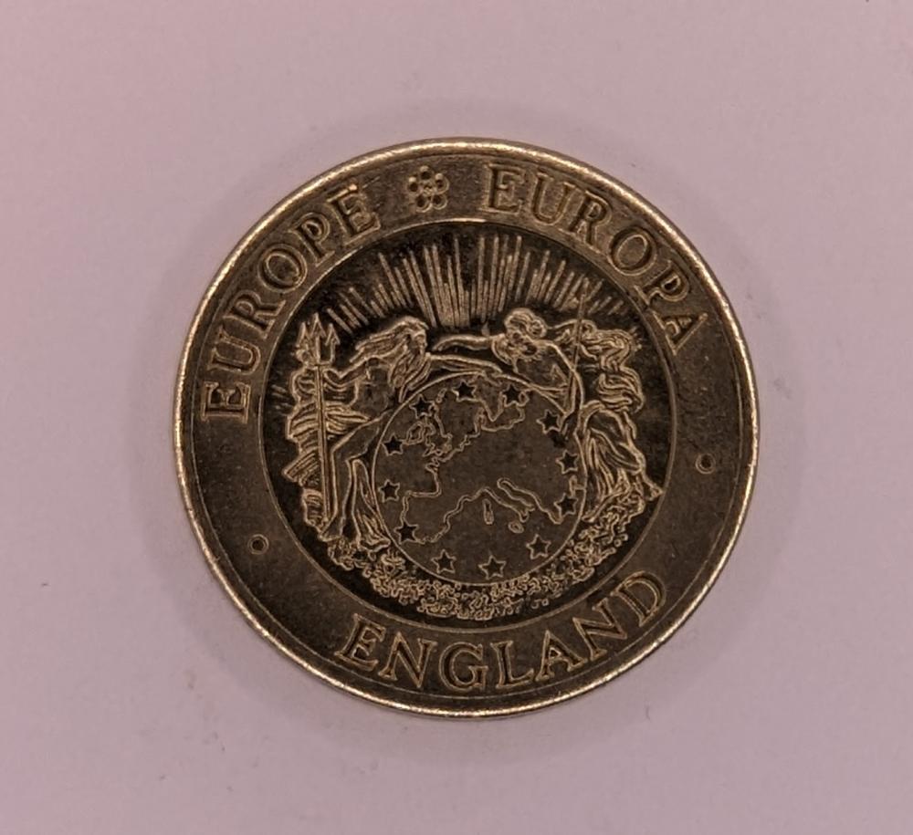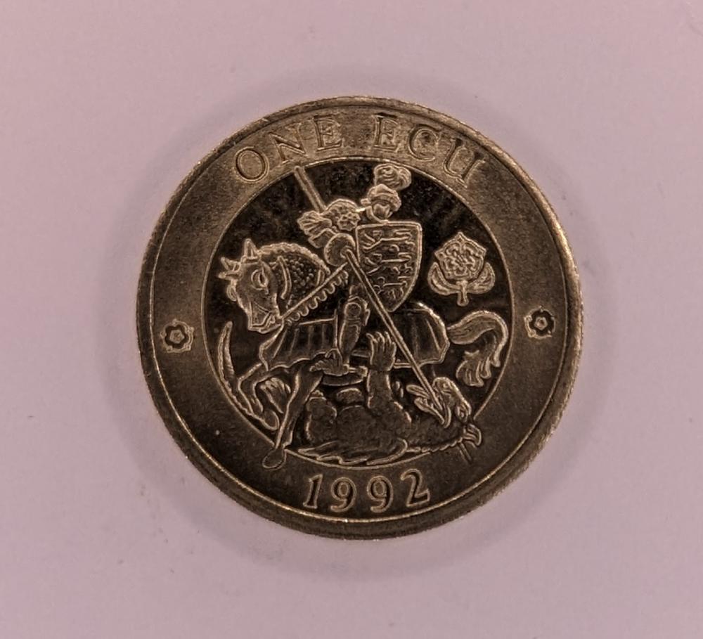 1 ECU coin featuring Queen Elizabeth II. Issued in 1992, this stunning coin showcases a beautifully designed obverse featuring Neptune and Europa standing beside a circular outlined map of Europe, highlighting the unity of the continent. The inscription 'EUROPE EUROPA ENGLAND' further emphasizes the strong ties between England and Europe. On the reverse, the coin depicts a majestic knight on horseback, wielding a shield and spear, valiantly slaying a dragon, symbolizing the enduring spirit of heroism and the fight against adversity. The inscription 'ONE ECU 1992' marks the coin's denomination and year of issue. This meticulously crafted ECU coin is a perfect addition to any numismatic collection, offering a tangible reminder of Europe's rich cultural heritage and the importance of unity.