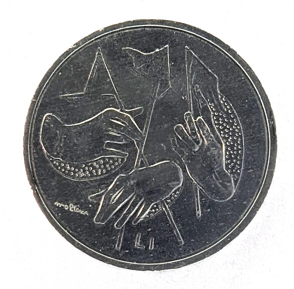 1 Lira coin issued by the Republic of San Marino in 1976, part of a set but presented here as an individual piece. The obverse features the national arms of San Marino with the legend REPUBBLICA·DI·SAN·MARINO· 1976. The reverse shows three hands, each holding a flag, designed by Mario Molteni and Franco Pioli. These symbolize the pluralism of ideas and beliefs, representing the citizen’s right to express opinions freely and without fear, in line with the principles of freedom and tolerance of San Marino.