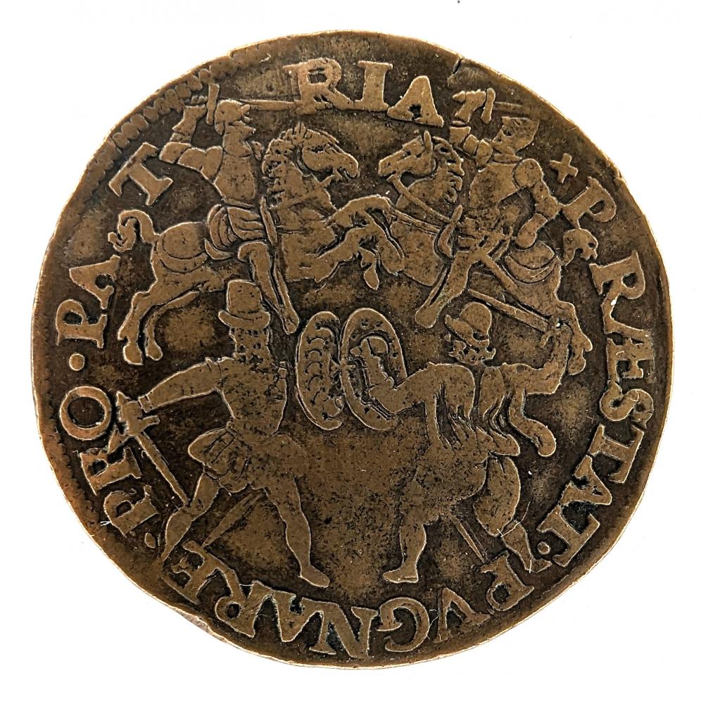 Promotional counter token issued in Dordrecht in 1579 urging continuation of the Dutch Revolt. The obverse depicts soldiers in battle with the legend PA·T·RIA·P·RAESTAT·PUGNARE·PRO. The reverse shows the headless bodies of Counts Egmont and Horn, with their severed heads impaled on posts, surrounded by the legend DECIPI·1579·QVAM·SIMVLATA·PACE. Lamoral, Count of Egmont, and Philip de Montmorency, Count of Horn, were prominent noblemen executed on 5 June 1568 by order of the Duke of Alba, an act that helped ignite the Dutch Revolt. This token served as a warning to negotiators in 1579 about the risks of seeking peace with Spain.