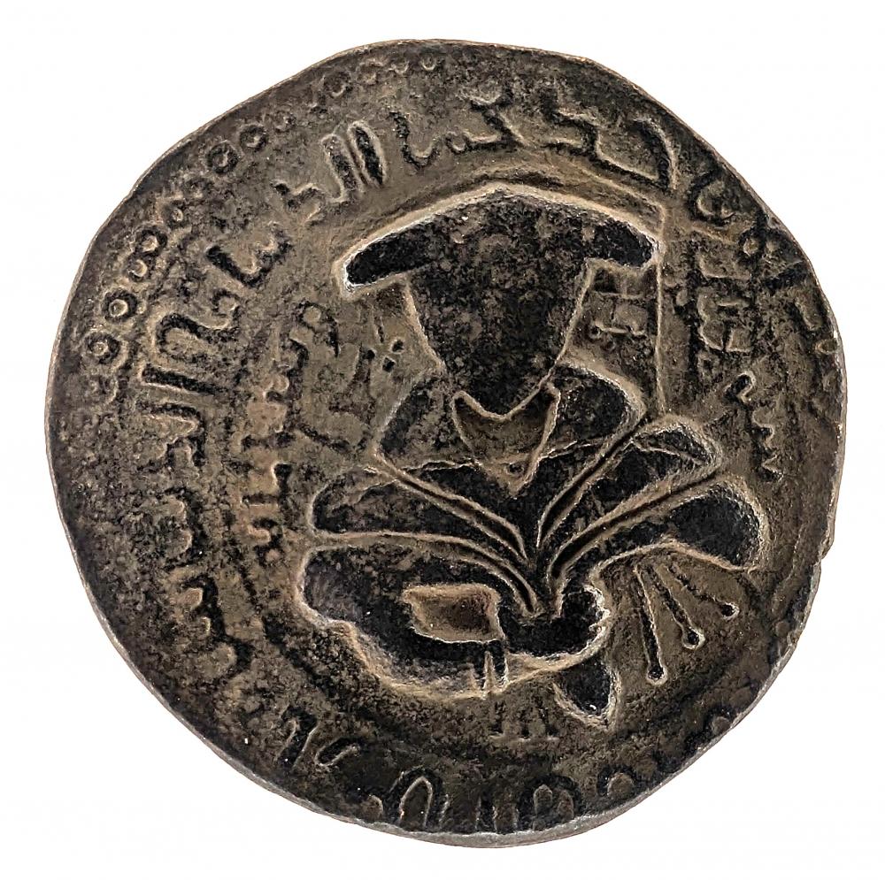 Silver Dirham issued in 605 AH (1209 AD) under al-Awhad Najm al-Din Ayyub at Mayafariqin, during the overlordship of al-‘Adil I. The obverse features a border of pellets with a counterclockwise marginal legend in Arabic. At the center is the facing bust of a turbaned prince with earrings or pendants, wearing a cloak gathered at the shoulders and held at the center with the left hand. Short legend flanks the head. The reverse presents a plain circle within a circle of pellets, enclosing a linear six-pointed star formed by two overlapping triangles, with Arabic inscriptions inside. Minted in Mayafariqin (modern Silvan, Turkey).
