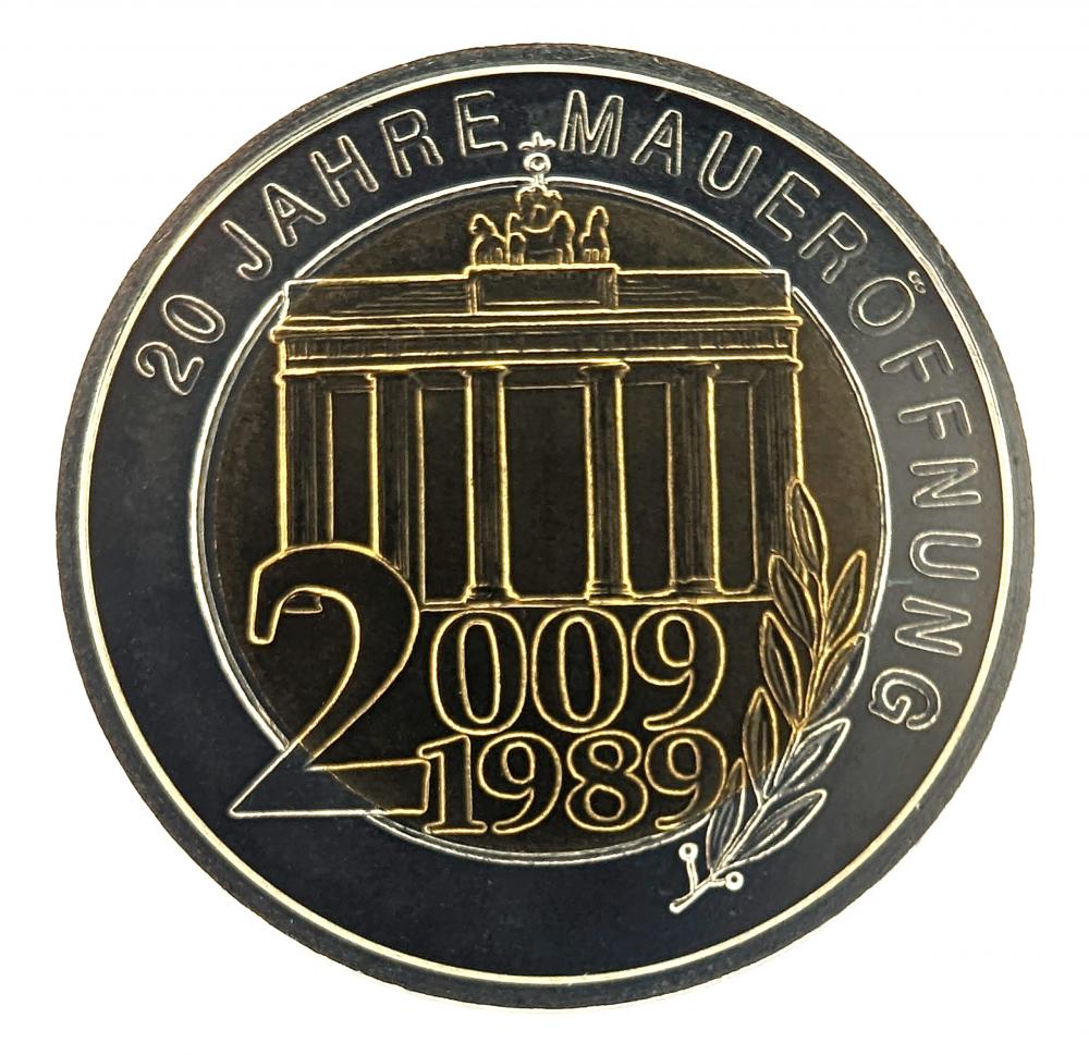 Commemorative medal marking the 20th anniversary of the fall of the Berlin Wall. The obverse shows the Berlin Arc with the inscription 20 JAHRE MAUEROFFNUNG 2009 1989. The reverse depicts children climbing over a wall with the inscription FLUCHT IN DIE DEUTSCHE BOTSCHAFT PRAG – SEPT. 1989. Issued as a reminder of the historical events of 1989 that led to German reunification.